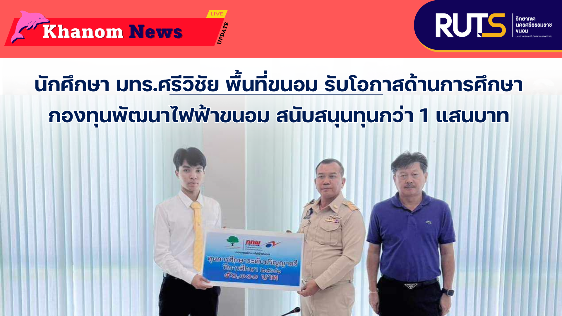 โดยมีนักศึกษา วิทยาลัยเทคโนโลยีอุตสาหกรรมและการจัดการ มทร.ศรีวิชัย พื้นที่ขนอม ได้รับการสนับสนุนทุนการศึกษา จำนวน 4 ราย วงเงิน 25,000 บาท/ปี จำนวน 3 ราย นายฉัตรมงคล ใจกว้าง นักศึกษาหลักสูตรวิชาวิศวกรรมไฟฟ้า ชั้นปีที่ 1, นายวีรภัทร ปัญญานฤพล นักศึกษาหลักสูตรวิชาวิศวกรรมไฟฟ้า ชั้นปีที่ 1, นางสาวนัทธิดา คงทอง นักศึกษาหลักสูตรวิชาการบัญชี ชั้นปีที่ 1 และ วงเงิน 50,000 บาท/ปี จำนวน 1 ราย นายจิรพัฒน์ ศรชัย นักศึกษาหลักสูตรวิชาวิศวกรรมไฟฟ้า ชั้นปีที่ 2 เพื่อสนับสนุนนักเรียน นักศึกษาที่เรียนดี ประพฤติดี สร้างขวัญและกำลังใจในการศึกษาเล่าเรียนของนักศึกษาต่อไป