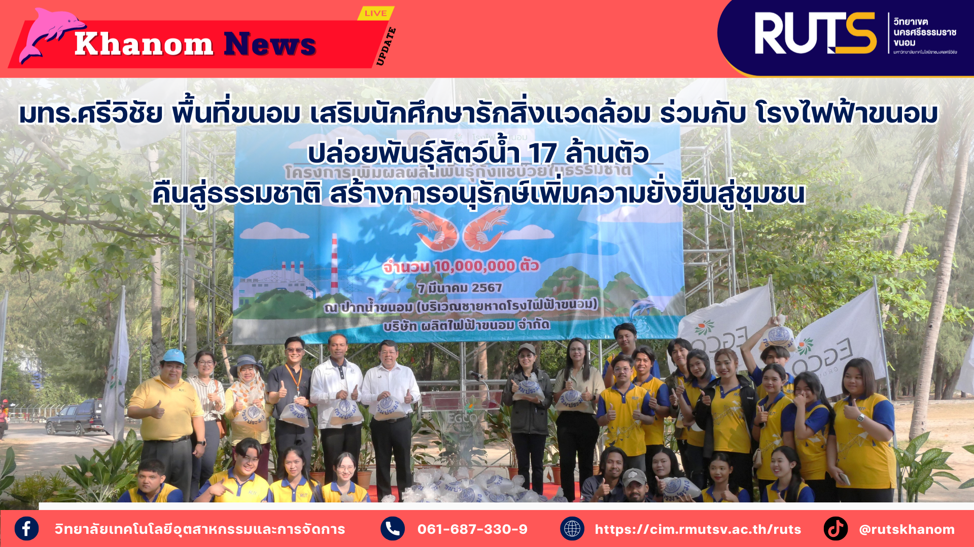 วันที่ 7 มีนาคม 2567 อาจารย์ทวีศักดิ์ ศรีภูงา ผู้อำนวยการวิทยาลัยเทคโนโลยีอุตสาหกรรมและการจัดการ มหาวิทยาลัยเทคโนโลยีราชมงคลศรีวิชัย พื้นที่ขนอม พร้อมด้วย อาจารย์ นักศึกษา เข้าร่วมโครงการเพิ่มผลผลิตพันธุ์กุ้งแชบ๊วยในธรรมชาติ ครั้งที่ 1 ประจำปี 2567 จำนวน 17,000,000 ตัว จัดโดย บริษัท ผลิตไฟฟ้าขนอม จำกัด (โรงไฟฟ้าขนอม) ร่วมกับ ศูนย์วิจัยและพัฒนาพันธุกรรมสัตว์น้ำนครศรีธรรมราช กรมประมง และ ได้รับเกียรติจาก นายฐิติวัชร บุญกิจ นายอำเภอขนอม เป็นประธานในการเปิดโครงการ หน่วยงานภาครัฐ ภาคเอกชน ภาคประชาชน ผู้นำชุมชน พี่น้องชาวประมง และผู้สนใจเข้าร่วมกว่า 300 คน ณ บริเวณบ้านพักรับรองชายทะเล อ.ขนอม จ.นครศรีธรรมราช