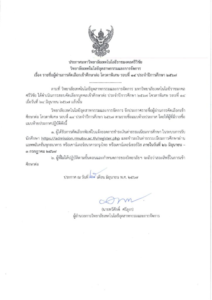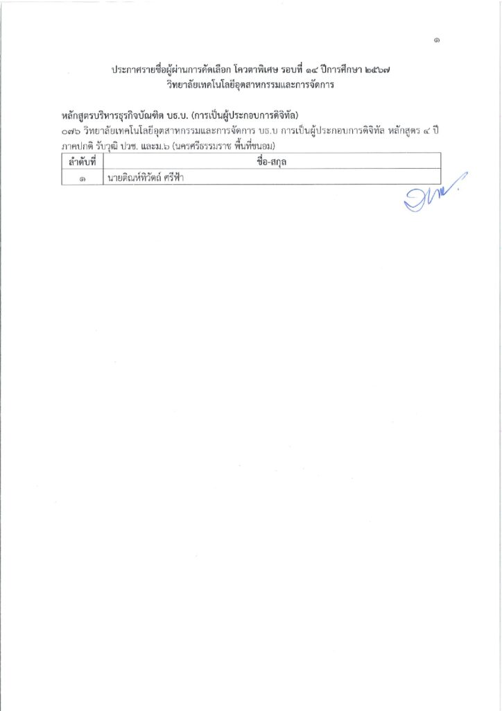 ประกาศ : รายชื่อผู้ผ่านการคัดเลือกเข้าศึกษาต่อ โควตาพิเศษ รอบที่ 14 ปีการศึกษา 2567