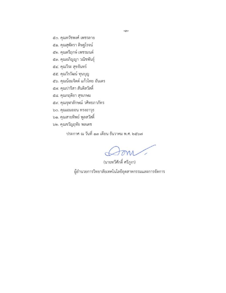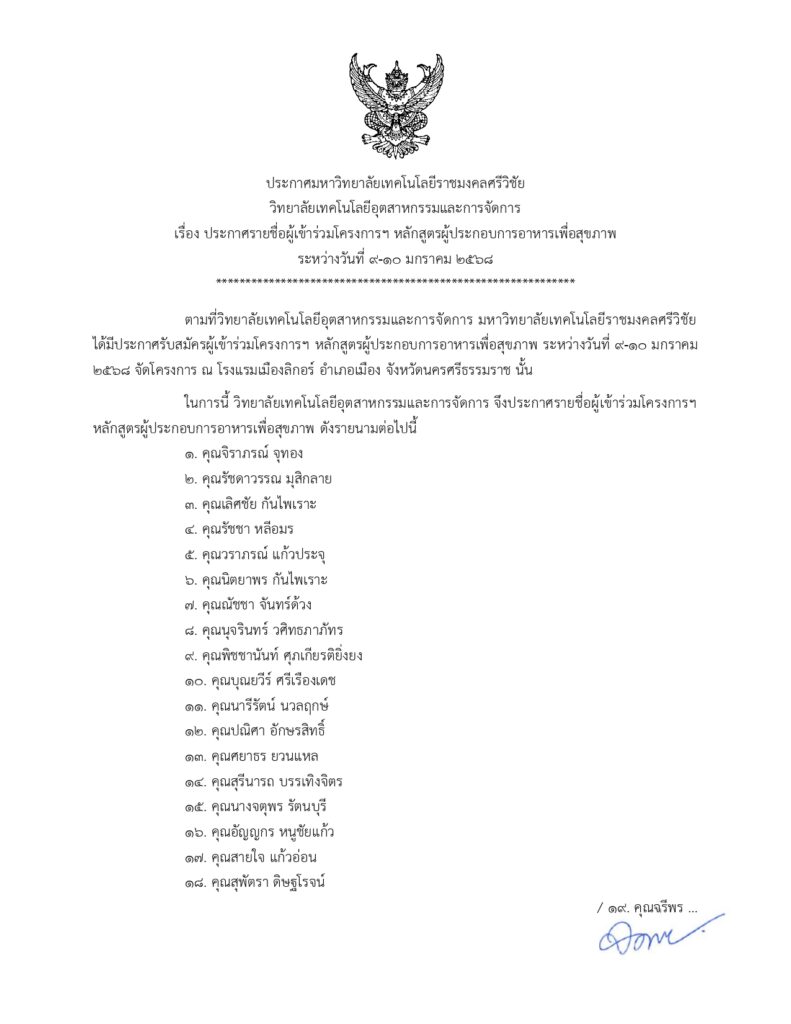 ประกาศ : รายชื่อผู้เข้าร่วมโครงการหลักสูตรผู้ประกอบการอาหารเพื่อสุขภาพ