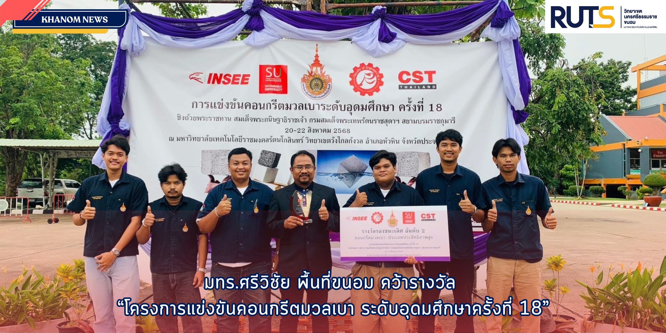 นักศึกษาสาขาวิศวกรรมโยธา วิทยาลัยเทคโนโลยีอุตสาหกรรมและการจัดการ มหาวิทยาลัยเทคโนโลยีราชมงคลศรีวิชัย พื้นที่ขนอม เข้าร่วม “โครงการแข่งขันคอนกรีตมวลเบา ระดับอุดมศึกษาครั้งที่ 18” ชิงถ้วยพระราชทานสมเด็จพระกนิษฐาธิราชเจ้า กรมสมเด็จพระเทพรัตนราชสุดาฯ สยามบรมราชกุมารี จัดขึ้นระหว่างวันที่ 20–22 สิงหาคม 2568 ณ มหาวิทยาลัยเทคโนโลยีราชมงคลรัตนโกสินทร์ วิทยาเขตวังไกลกังวล จังหวัดประจวบคีรีขันธ์ การเข้าร่วมแข่งขันในครั้งนี้ นำโดย ผู้ช่วยศาสตราจารย์ ดร.ทวิช กล้าแท้ อาจารย์ประจำหลักสูตรวิศวกรรมโยธา พร้อมด้วยทีมนักศึกษาที่ทุ่มเทแรงกายแรงใจตลอดระยะเวลาการเตรียมงานและการลงสนามจริง ผลการแข่งขัน นักศึกษา RUTS Khanom สามารถสร้างชื่อเสียงและความภาคภูมิใจให้กับสถาบัน ด้วยการคว้ารางวัล รองชนะเลิศอันดับสอง ประเภทคอนกรีตมวลเบา – ประเภทน้ำหนักเบาและสิทธิภาพสูง ถือเป็นอีกหนึ่งผลงานที่สะท้อนถึงศักยภาพ ความรู้ความสามารถ และความมุ่งมั่นของนักศึกษา ตลอดจนการสนับสนุนจากคณาจารย์ผู้ควบคุมทีม