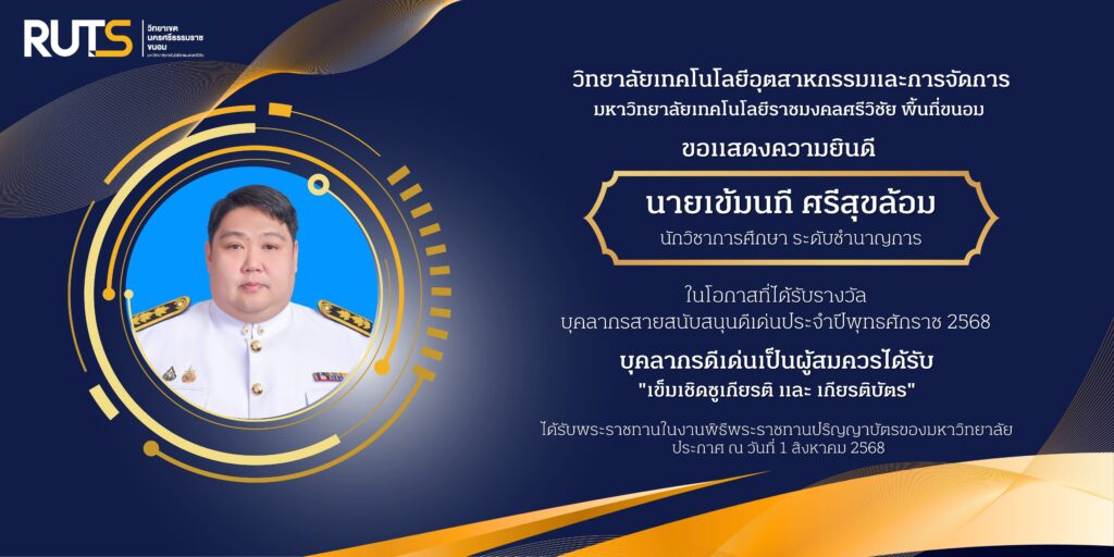 ขอแสดงความยินดีกับ นายเข้มนที ศรีสุขล้อม นักวิชาการศึกษา ระดับชำนาญการ วิทยาลัยเทคโนโลยีอุตสาหกรรมและการจัดการ มหาวิทยาลัยเทคโนโลยีราชมงคลศรีวิชัย วิทยาเขตนครศรีธรรมราช พื้นที่ขนอม ในโอกาสที่ได้รับรางวัล “บุคลากรสายสนับสนุนดีเด่น ประจำปีพุทธศักราช 2568”