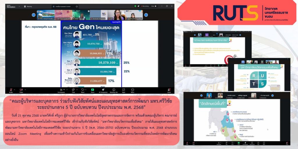 วันที่ 21 ตุลาคม 2568 นายทวีศักดิ์ ศรีภูงา ผู้อำนวยการวิทยาลัยเทคโนโลยีอุตสาหกรรมและการจัดการ พร้อมด้วยคณะผู้บริหาร คณาจารย์ และบุคลากร มหาวิทยาลัยเทคโนโลยีราชมงคลศรีวิชัย เข้าร่วมรับฟังวิสัยทัศน์ “มหาวิทยาลัยนวัตกรรมเพื่อสังคม” ภายใต้แผนยุทธศาสตร์การพัฒนามหาวิทยาลัยเทคโนโลยีราชมงคลศรีวิชัย ระยะปานกลาง 5 ปี (พ.ศ. 2566–2570) ฉบับทบทวน ปีงบประมาณ พ.ศ. 2568 ผ่านระบบออนไลน์ Zoom Meeting เพื่อสร้างความเข้าใจร่วมกันในการขับเคลื่อนมหาวิทยาลัยสู่การเป็นองค์กรนวัตกรรมที่ตอบโจทย์การพัฒนาสังคมอย่างยั่งยืน