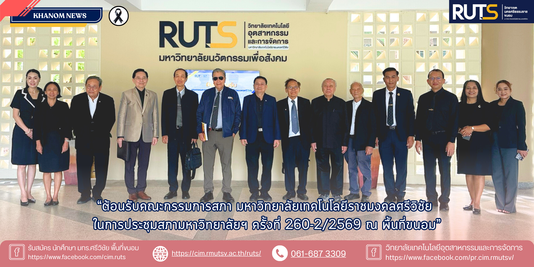 วันที่ 19 กุมภาพันธ์ 2569 ผู้ช่วยศาสตราจารย์ไพโรจน์ แสงอำไพ ผู้อำนวยการวิทยาลัยเทคโนโลยีอุตสาหกรรมและการจัดการ พร้อมคณะผู้บรหาร อาจารย์ บุคลากร และนักศึกษา ให้การต้อนรับคณะกรรมการสภามหาวิทยาลัยเทคโนโลยีราชมงคลศรีวิชัย พร้อมเข้าร่วมรับฟังและสังเกตการณ์การประชุมสภามหาวิทยาลัยฯ ครั้งที่ 260-2/2569