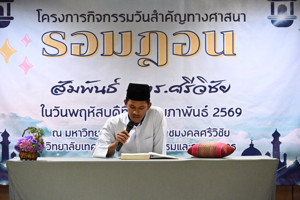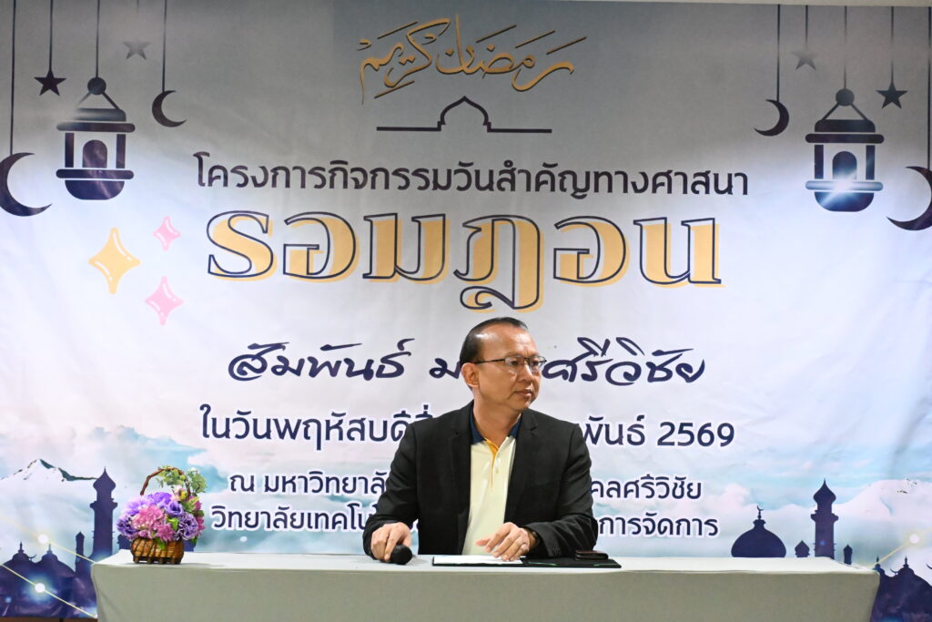 26 กุมภาพันธ์ 2569 วิทยาลัยเทคโนโลยีอุตสาหกรรมและการจัดการ มหาวิทยาลัยเทคโนโลยีราชมงคลศรีวิชัย พื้นที่ขนอม จัดโครงการกิจกรรมวันสำคัญทางศาสนา “รอมฎอนสัมพันธ์ มทร.ศรีวิชัย” ณ ห้องประชุมใหญ่ ชั้น 3 อาคารปฏิบัติการโรงแรมและศูนย์ฝึกอบรม เพื่อส่งเสริมคุณธรรม จริยธรรม และความเข้าใจอันดีในหลักปฏิบัติทางศาสนาอิสลามในช่วงเดือนรอมฎอน